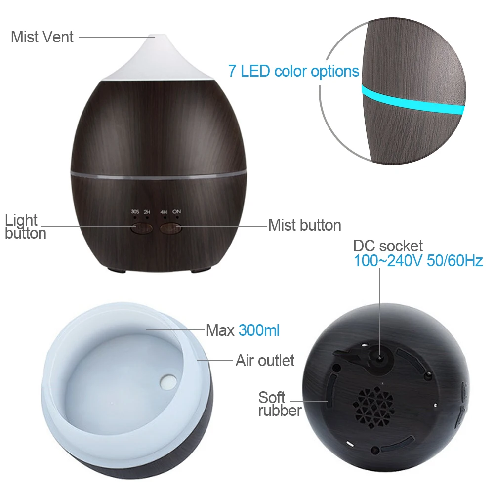 | KBAYBO 300ml Humidifier Aroma Diffuser Aromatherapy Wood Grain Essential Oil Diffuser Ultrasonic Cool Mist maker for Office Home |